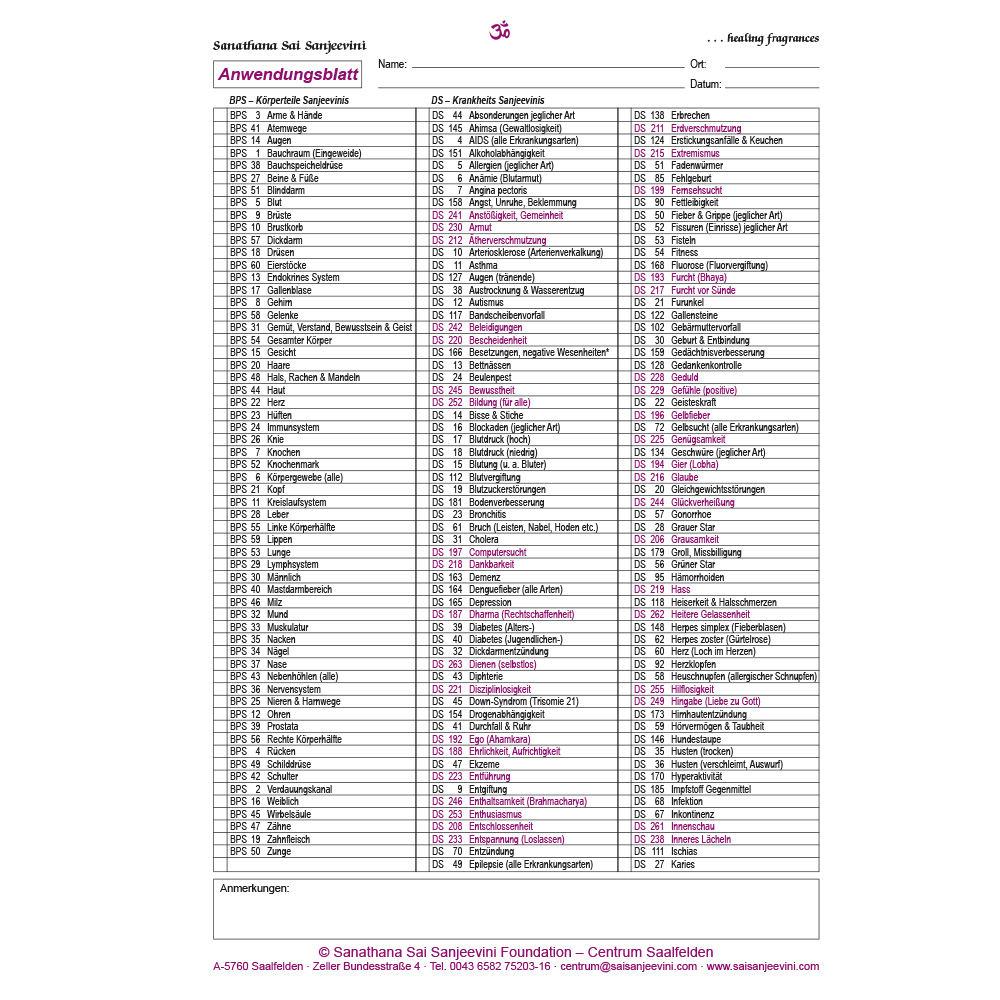 Vor- und Rückseite alphabetisch geordnet: SSC-Kombinationen, BPS-Sanjeevini, DS-Sanjeevini